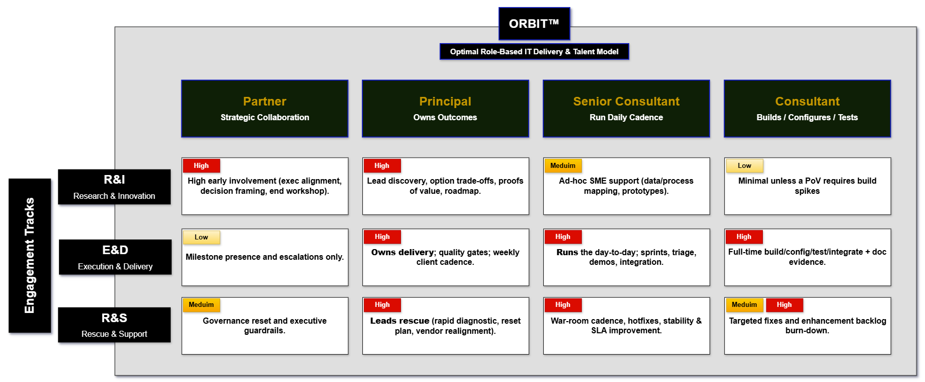 ORBIT™ is the who & how: a tiered talent model that applies the right altitude of expertise (Partner / Principal / Senior Consultant / Consultant) at the right moment.