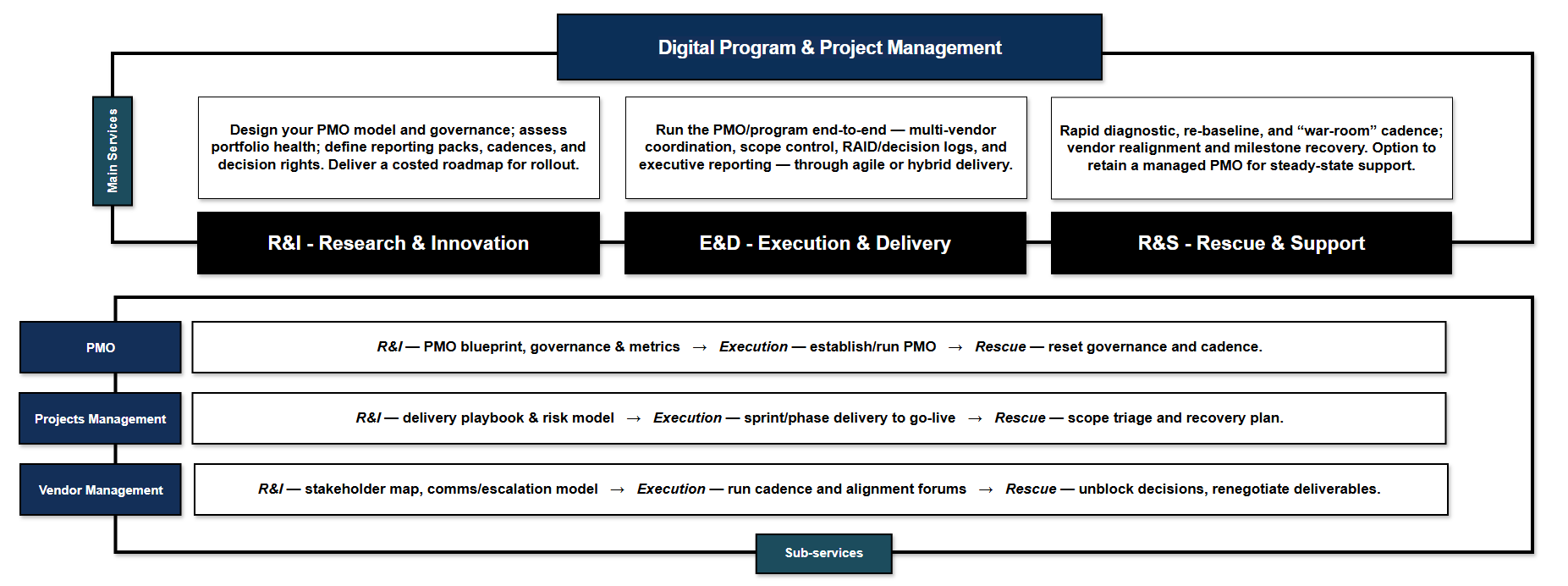 R&I — PMO blueprint, governance & metrics → Execution — establish/run PMO → Rescue — reset governance and cadence.