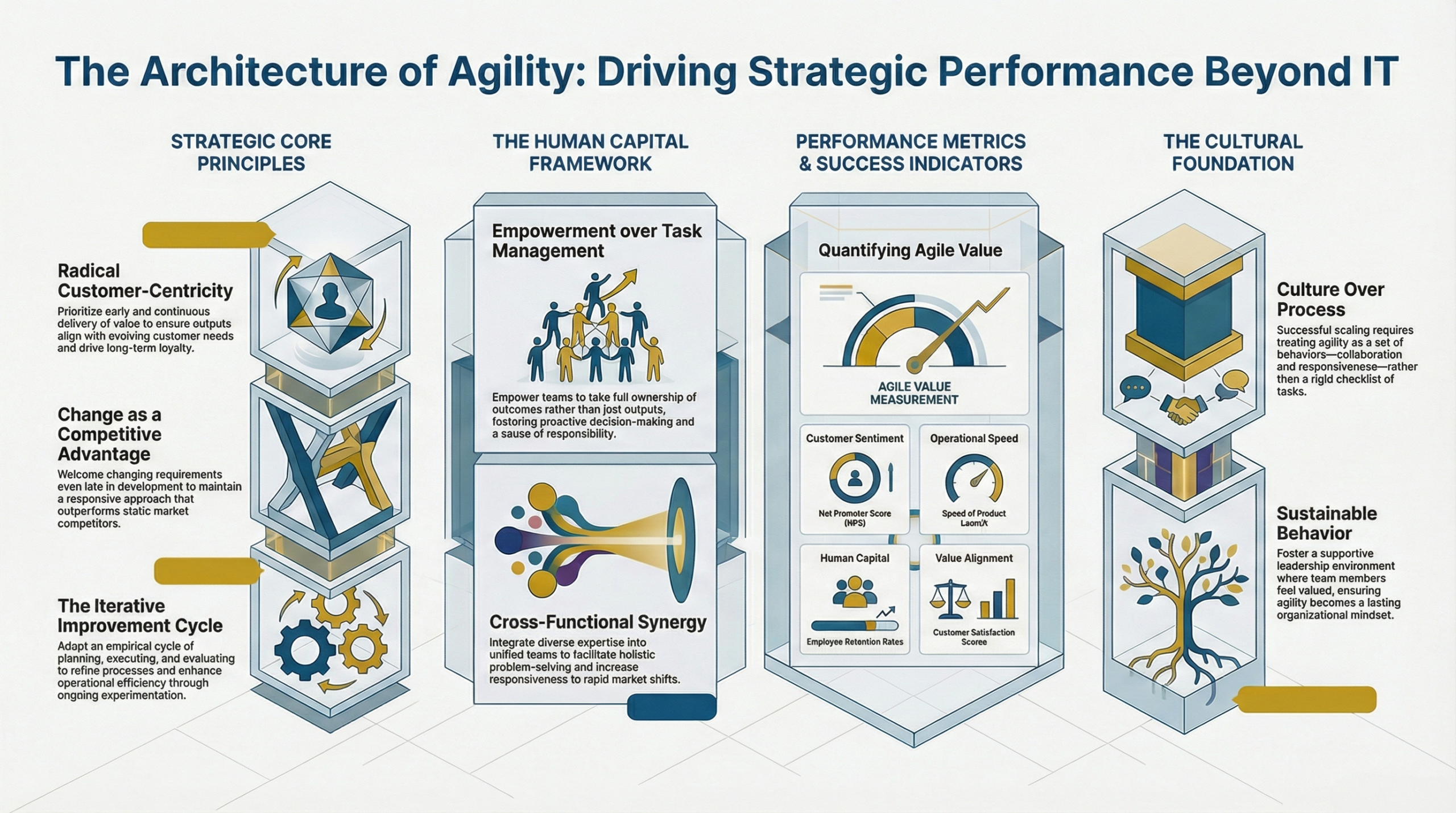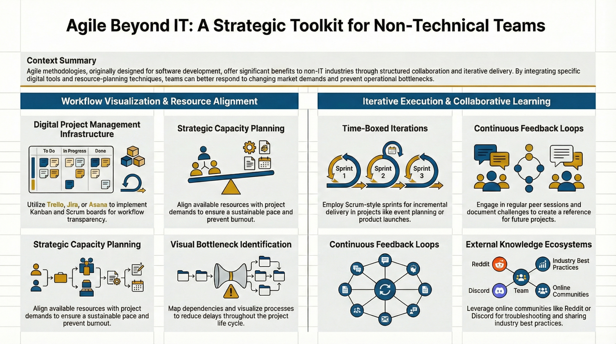 Agility Beyond IT is a contemporary framework that extends agile methodologies beyond traditional IT environments, emphasizing the application of agility principles in various sectors. This approach is significant because it enables organizations to enhance collaboration, increase operational efficiency, and foster innovation across diverse teams, regardless of their technical background. As businesses face rapidly changing market conditions and customer demands, the need for agile practices that prioritize responsiveness and adaptability has become more critical than ever. [1] [2] The framework centers on several core principles, including a customer-centric focus, the embrace of change, iterative learning and improvement, and the empowerment of teams. By prioritizing customer satisfaction through early and continuous delivery of value, organizations can ensure their offerings align with customer needs and expectations. [3] [4] Furthermore, the culture of collaboration and autonomy promoted within agile practices facilitates a more dynamic work environment, enabling teams to navigate complexities and challenges more effectively. [5] [6] However, implementing agility beyond IT is not without its challenges. Organizations often encounter resistance to change, rooted in traditional hierarchies and control-based cultures. To address these barriers, effective strategies such as piloting projects, engaging stakeholders, and fostering a culture of continuous improvement are crucial for successful adoption. [7] [8] Moreover, case studies in sectors like education and healthcare illustrate both the potential and the hurdles of integrating agile methodologies, highlighting the need for tailored approaches that suit specific operational contexts [9] [10] Overall, “Agility Beyond IT” represents a transformative shift in how organizations operate, encouraging a mindset that prioritizes flexibility and responsiveness while navigating the complexities of modern business environments. As industries increasingly recognize the value of agility, the potential for improved performance and customer satisfaction continues to grow. [11] [12]