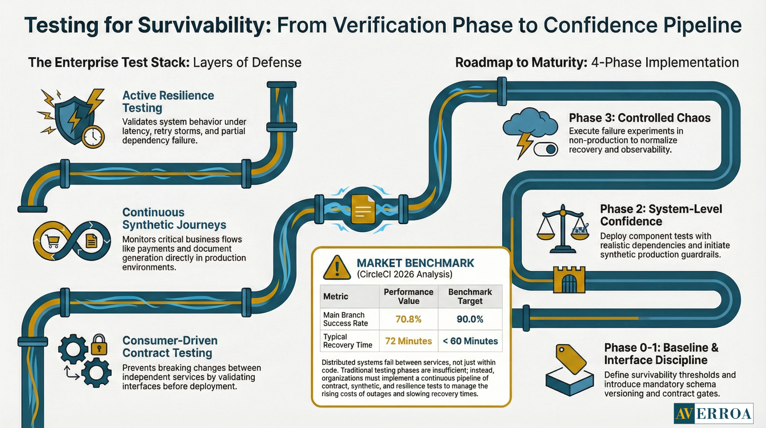 Unit tests are necessary and insufficient. In a distributed system, the dominant failure modes live between services. That is why testing must move from “does my code work” to “does the system survive realistic failure”.
