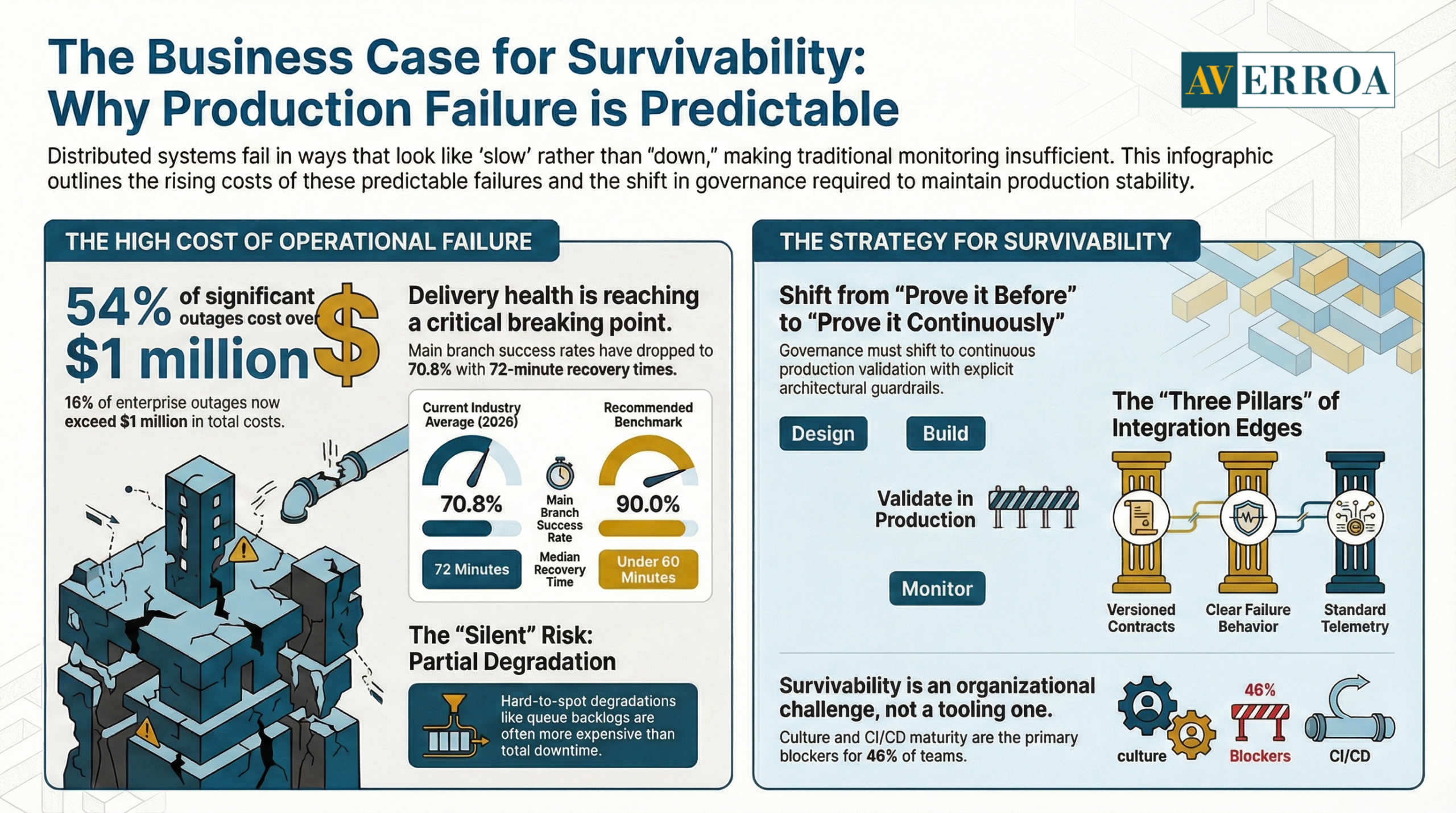 - “Green builds, red production”, because integration paths were not tested under latency and partial failure.